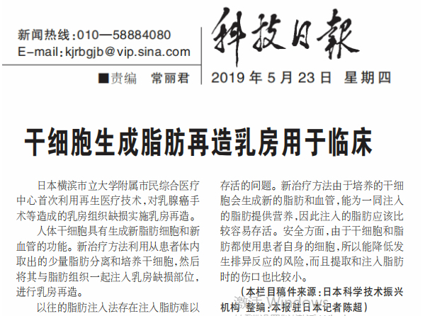 《科技日?qǐng)?bào)》:干細(xì)胞生成脂肪再造乳房用于臨床