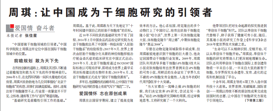 《科技日?qǐng)?bào)》周琪:讓中國成為干細(xì)胞研究的引領(lǐng)者
